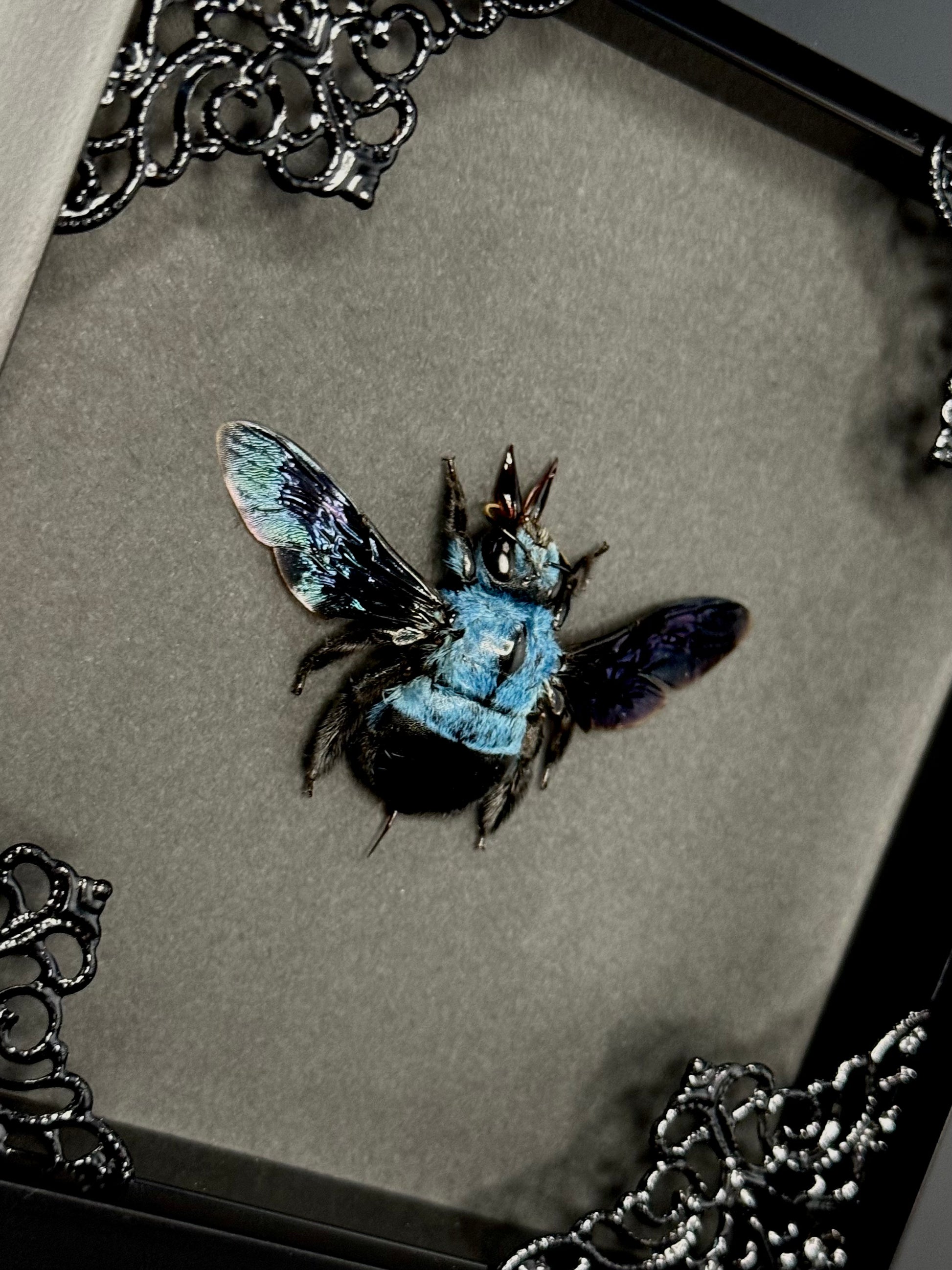 Sustainably sourced specimen in a black shadow box frame with metal corner embellishments.