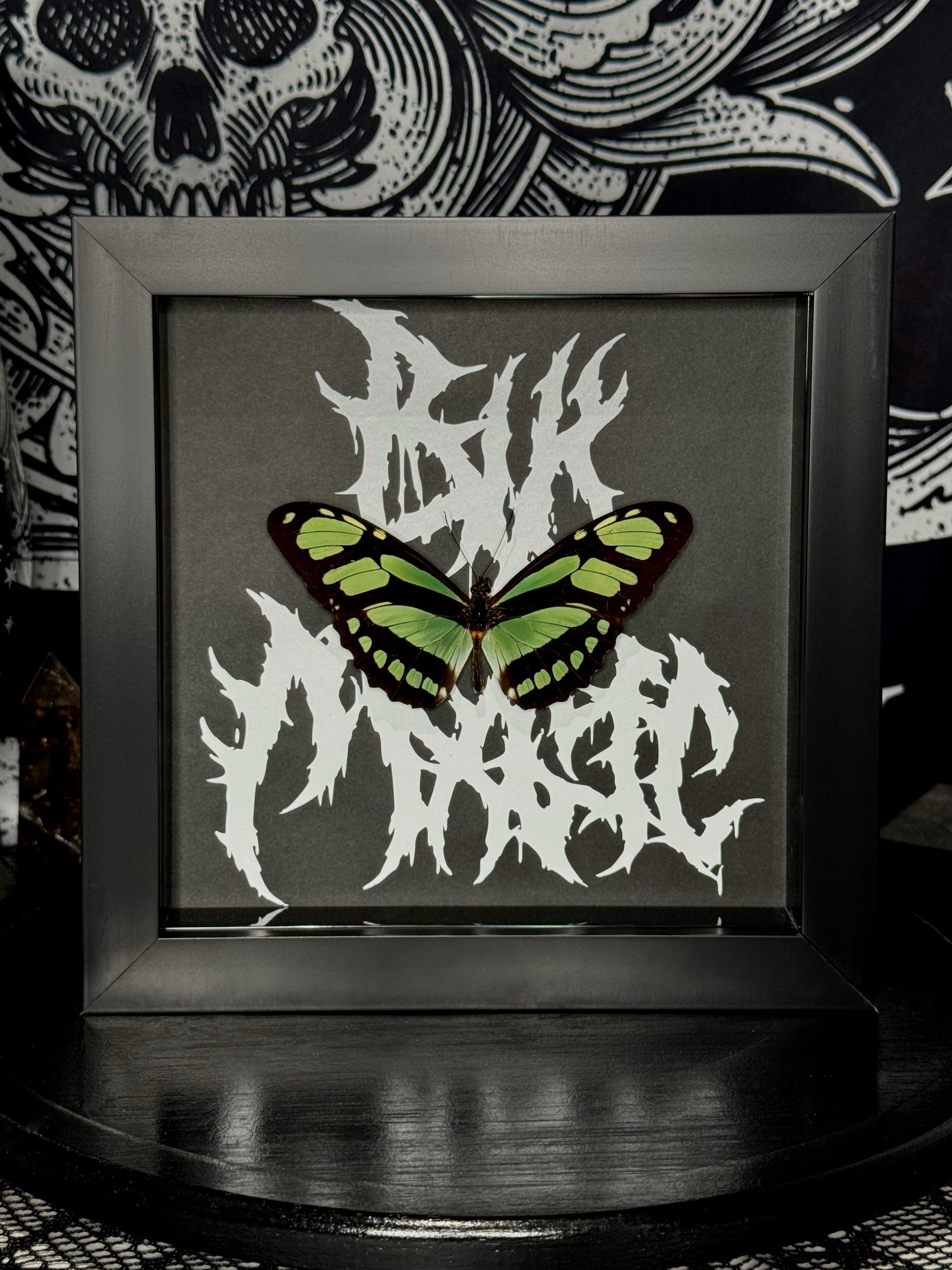 Sustainably sourced specimen in a black shadow box frame with a decal background.