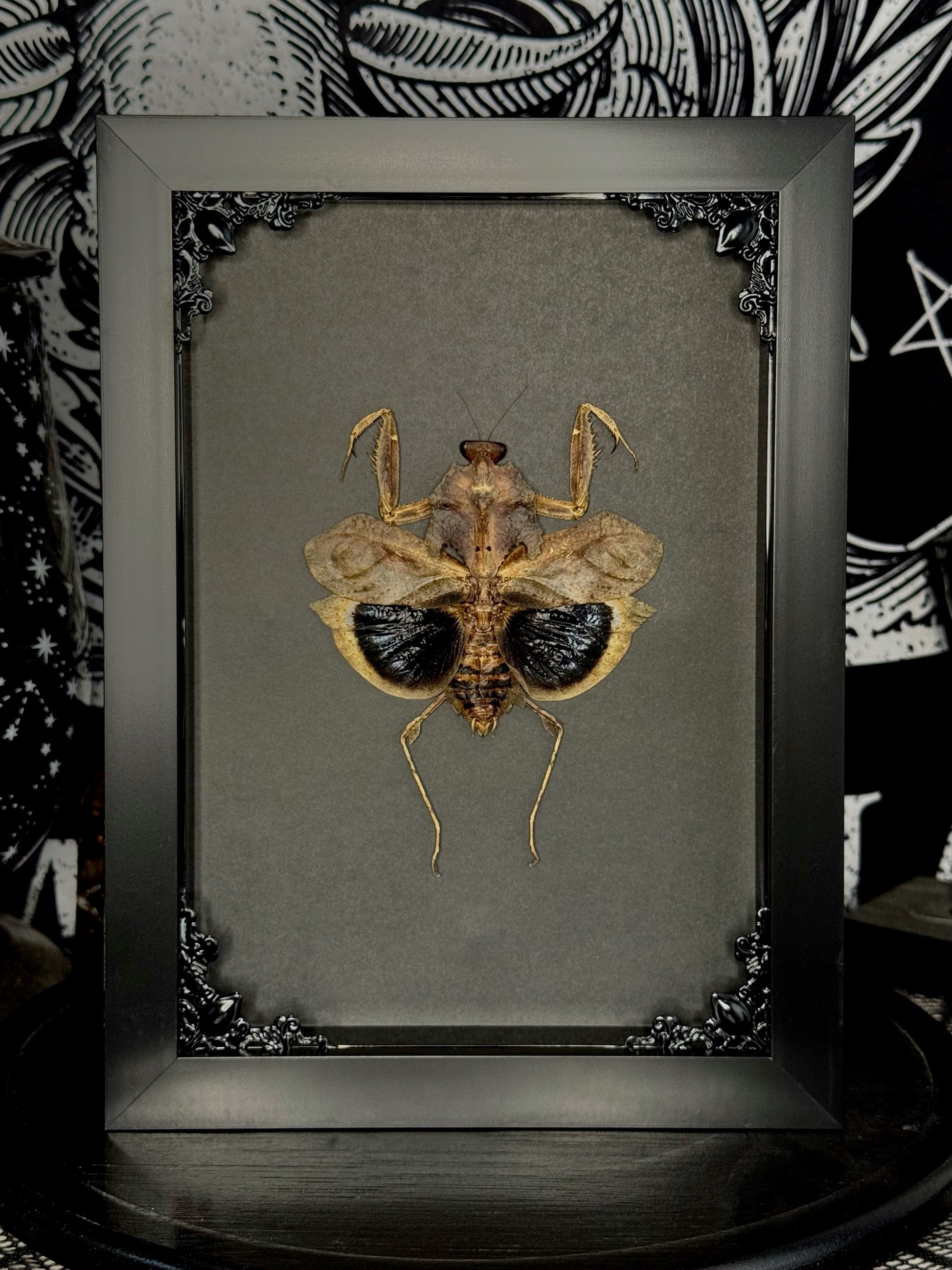 Sustainably sourced specimen in a black shadow box frame with metal corner embellishments.