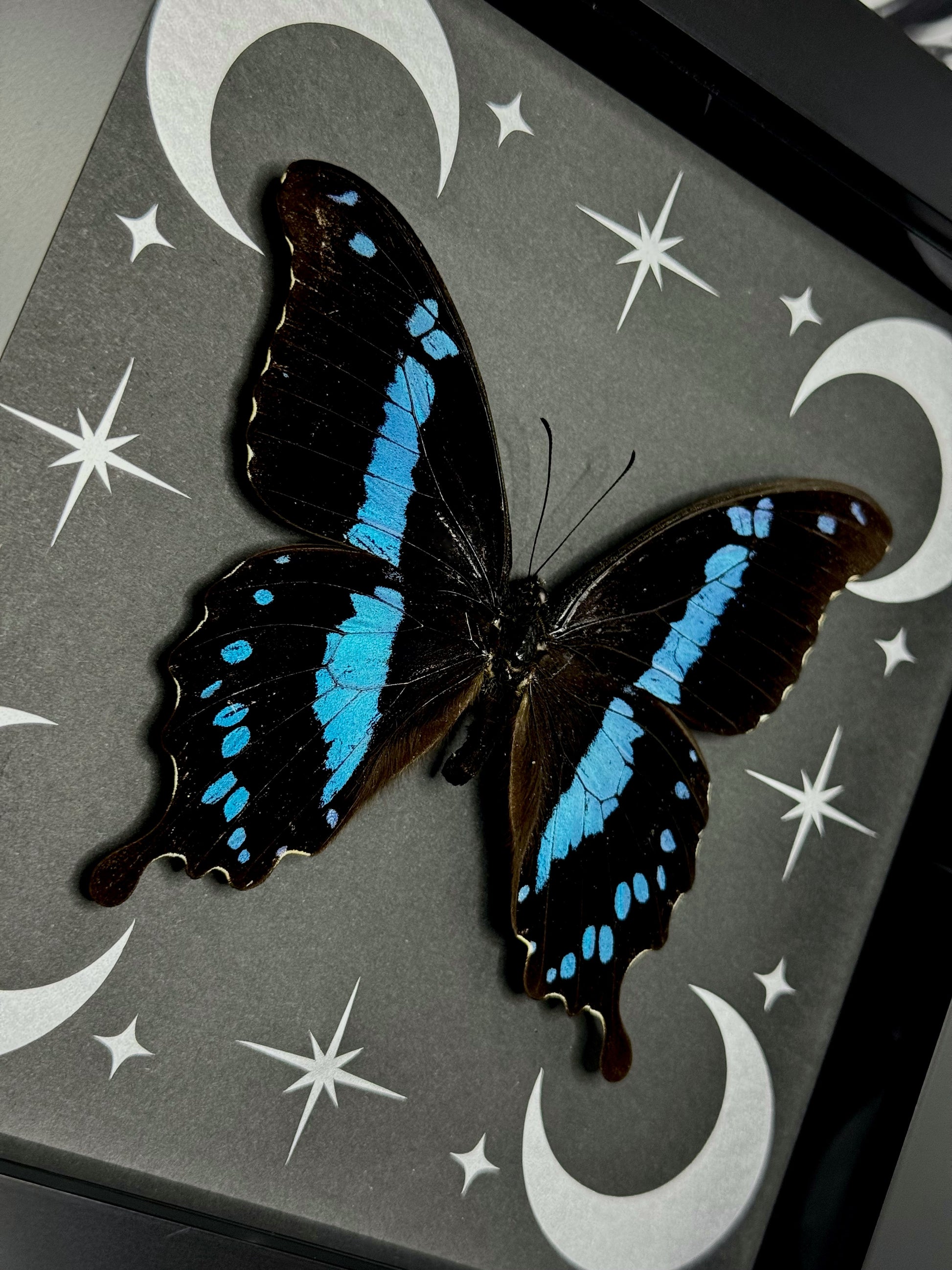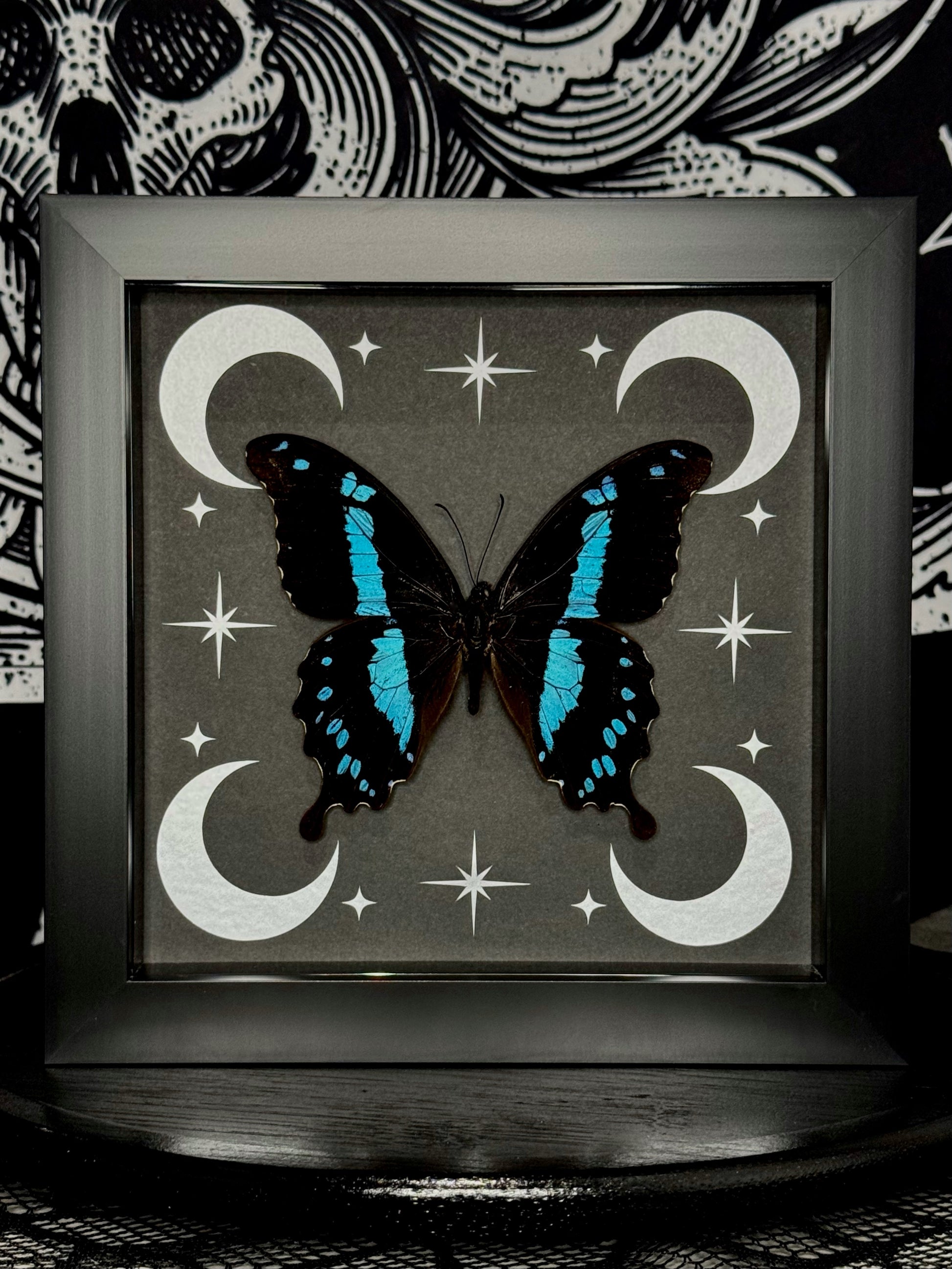 Sustainably sourced specimen in a black shadow box frame with decal background