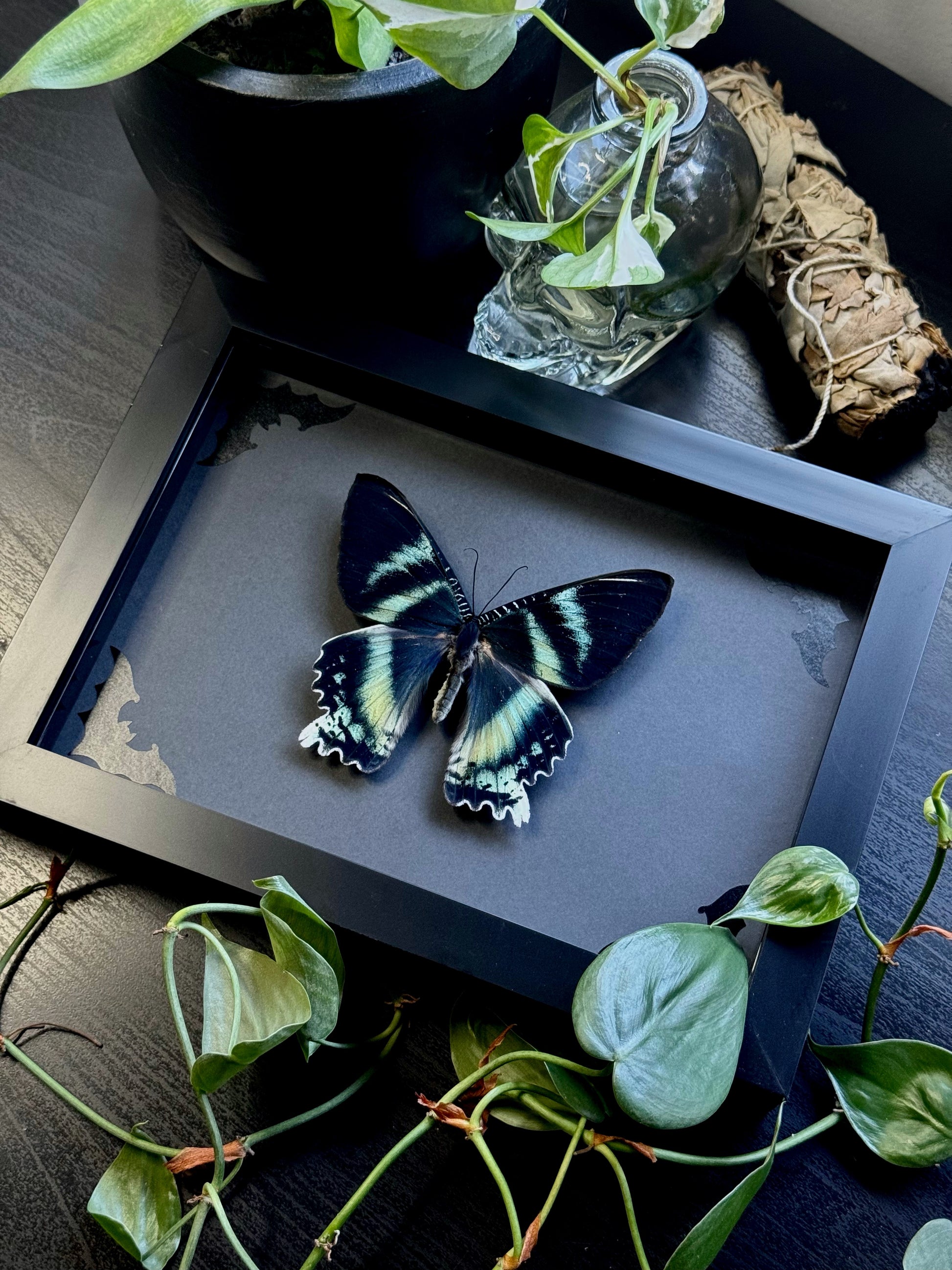 Sustainably sourced specimen in a black shadow box frame with decal background