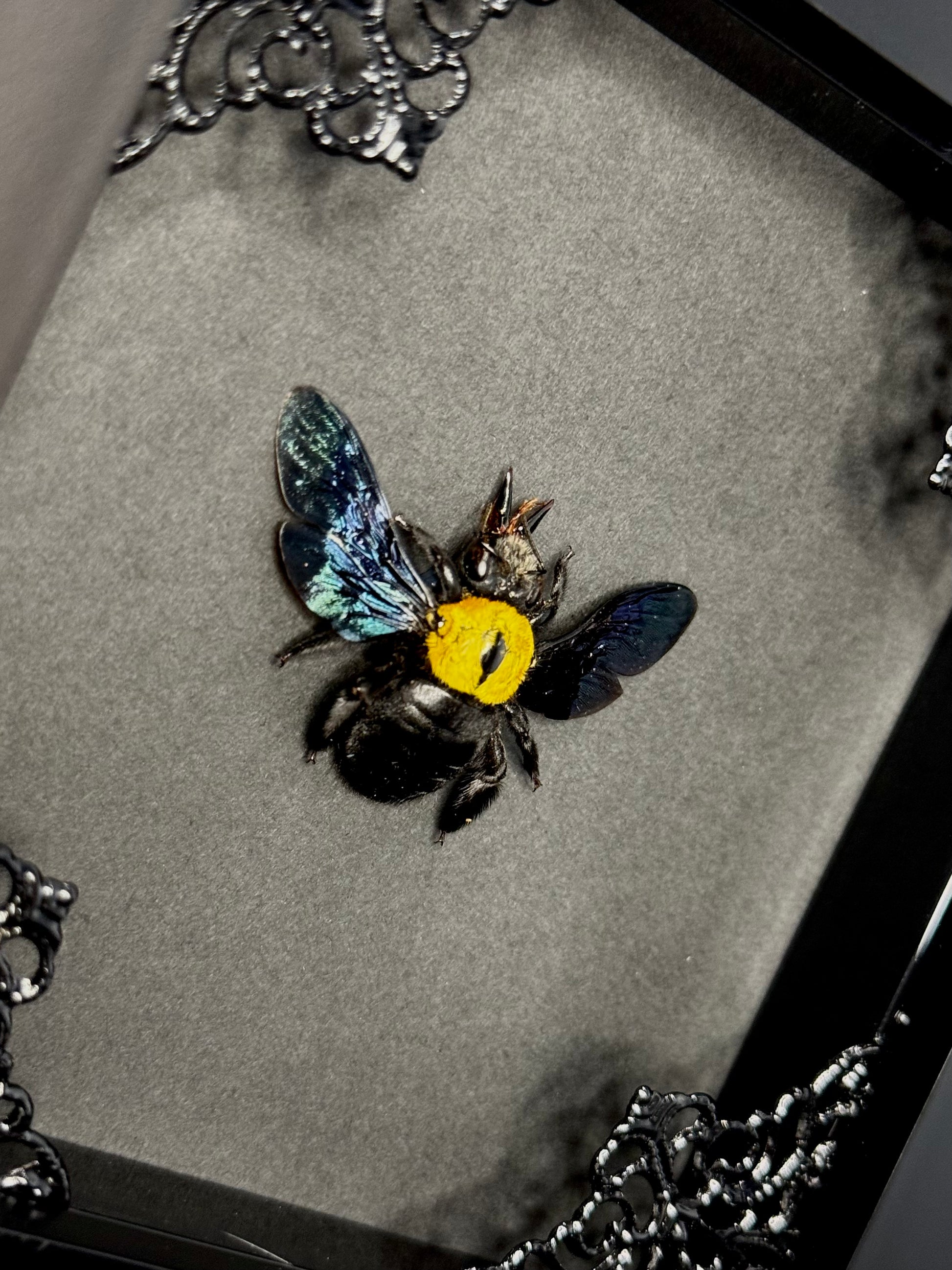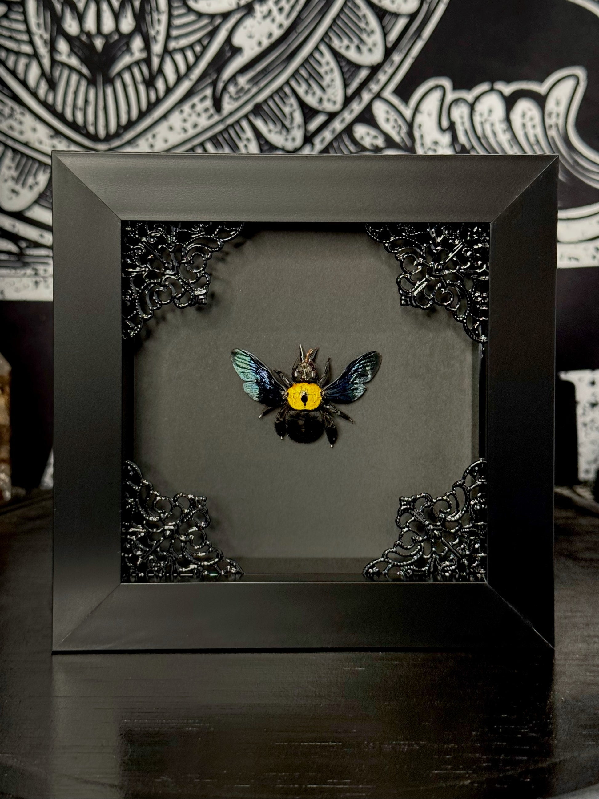 Sustainably sourced specimen in a black shadow box frame with metal corner embellishments.